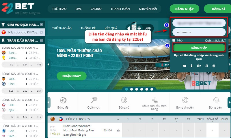 Nếu bạn đã đăng ký tài khoản tại nhà cái 22bet thì tiếp theo chỉ cần tiến hành điền tên đăng nhập và mật khẩu sau đó bấm vào ô “đăng nhập” để đăng nhập 22bet như hình ảnh bên dưới.