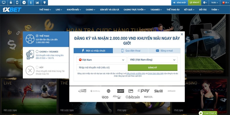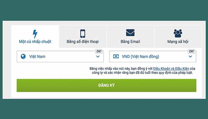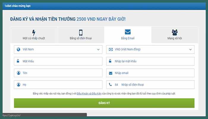 Sau khi nhấn chuột vào chữ ĐĂNG KÝ, tại nhà cái 1xBet sẽ hỗ trợ cho bạn 3 sự lựa chọn để đăng ký đó là đăng ký bằng số điện thoại, đăng ký bằng một cú nhấp chuột và đăng ký bằng email.