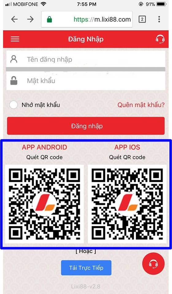 Đầu tiên các bạn tiến hành đăng nhập lixi88: bấm vào Tải trực tiếp => Click để tải về => Install.