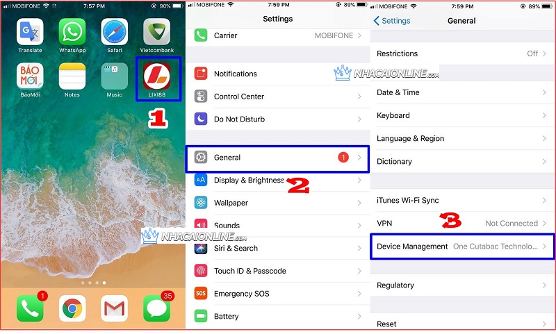 Để khắc phục các vấn đề, bạn cần phải thực hiện thao tác như sau: Vào Setting (cài đặt), chọn General (cài đặt chung), chọn tiếp Device Manegement (quản lý thiết bị) và chọn Tin cậy (One Cutabac Techonologies Corp) =>Trust (tin cậy).