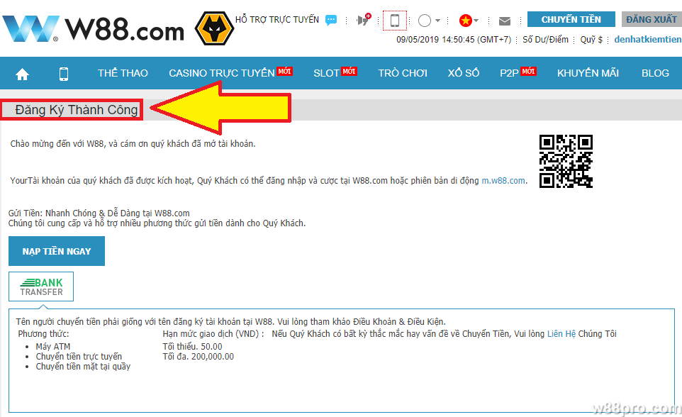 Sau khi đăng ký xong, giao diện sẽ hiển thị như hình dưới. Như vậy bạn đã hoàn tất việc đăng ký tài khoản của mình tại nhà cái W88.