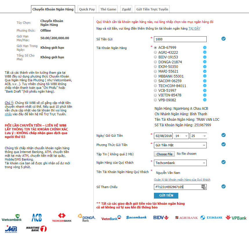 Bước 2: Nộp tiền vào tài khoản ngân hàng của W88